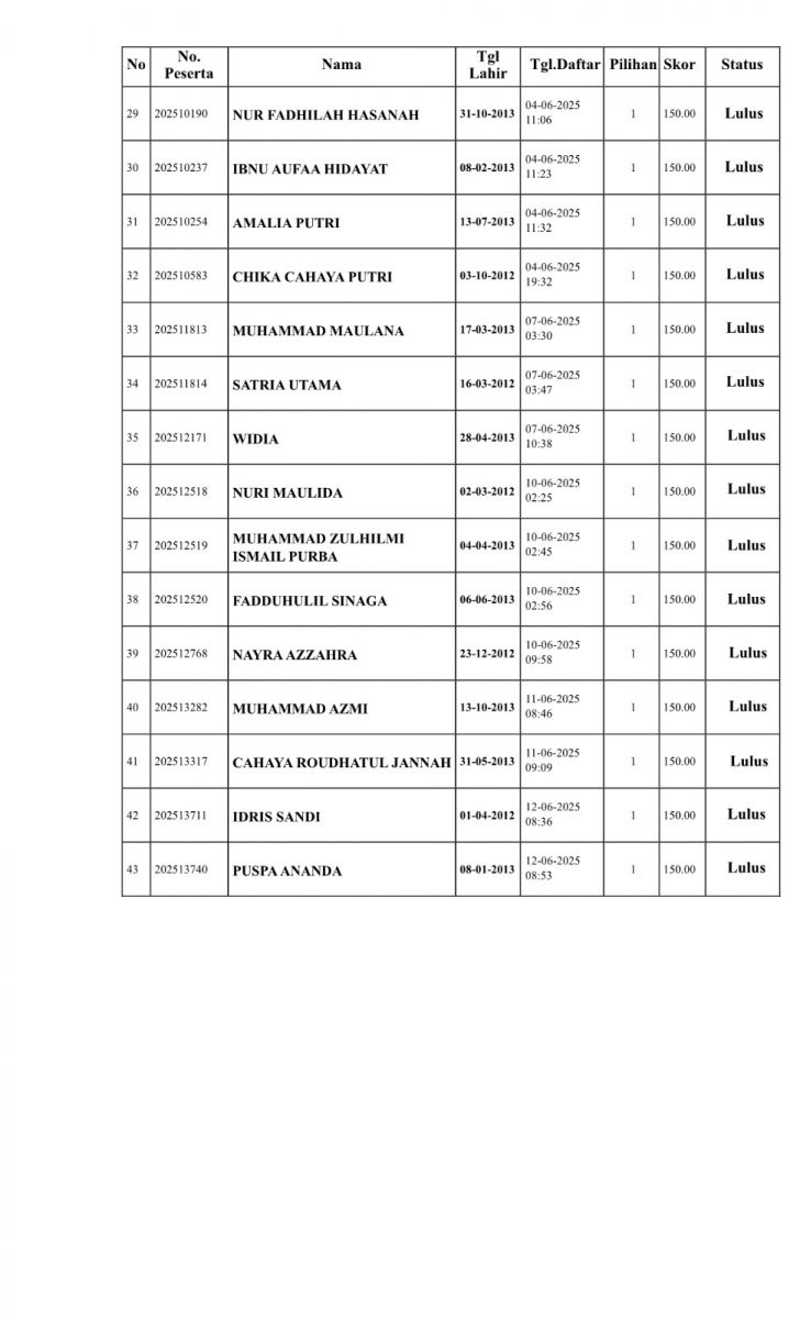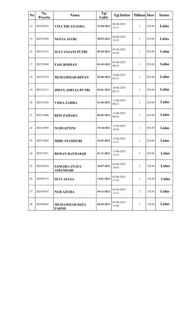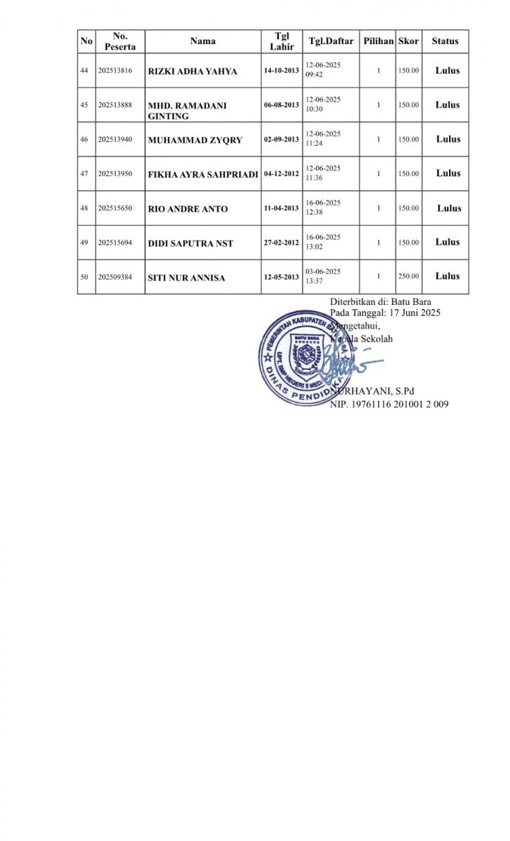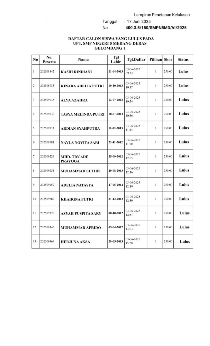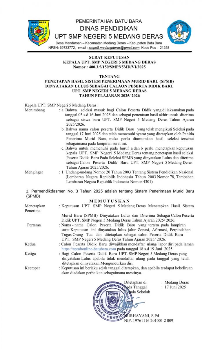 KEPUTUSAN KELULUSAN SPMB UPT SMP NEGERI 5 MEDANG DERAS T.A 2025-2026